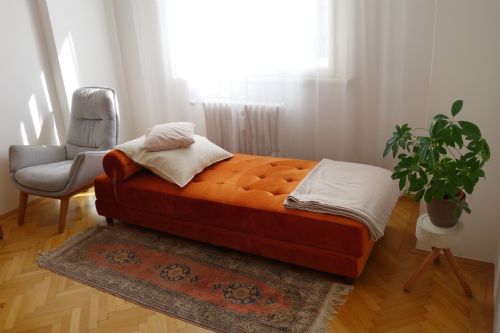 Praxisraum 1 ist mit Besprechungstisch, Liegecouch bzw. Sitzecke eingerichtet. Er eignet sich für Einzeltherapie, Paartherapie, Coaching, Training, Supervision und Kleingruppen bis zu 4-5 Personen.