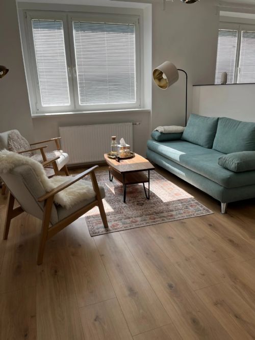 TherapieraumCouch und Sessel im Therapieraum. Hier findet der gemeinschaftliche Teil der Arbeit von Psychotherapeutin in Ausbildung unter Supervision Verica Mitrovic mit ihren Patient*innen statt.
