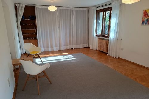 Blick in den freundlichen, lichtdurchfluteten Praxisraum mit gemütlicher Sitzecke.